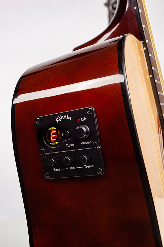 The Kohala KG100SE full size guitar is an all new student Steel string guitar featuring an Adjustable Truss Rod for maximum playability, Properly Cured Woods and Bracing for increased durability, Special Fret Installation and Pressurized Gluing methods for enhanced performance. The pickup has volume, EQ/Tone allows more volume with any guitar style amplifier. The convenient on-board tuner is accurate and easy to use. Each Kohala guitar comes with a 5mm Padded Gig Bag.