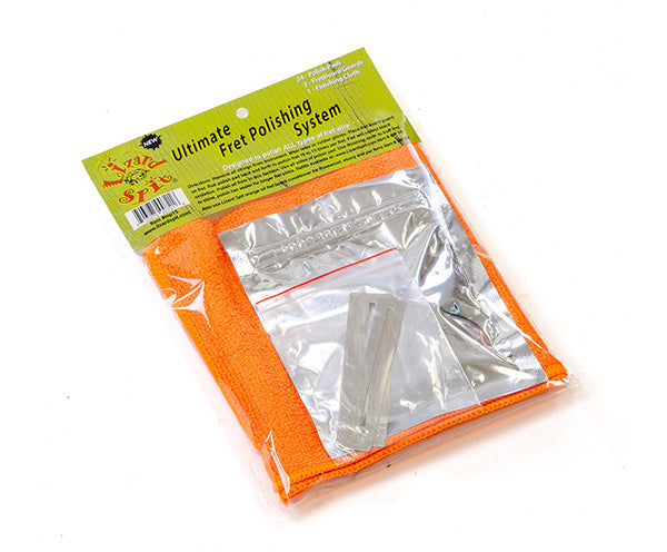 MP15 - FRET POLISHING KIT quickly cleans frets with barrier protectant that seals fret wires to stop oxidation. Features easy-to-use disposable polishing pads. Includes 2 fret guards, 24 pack of polish pads and microfibre cleaning cloth.