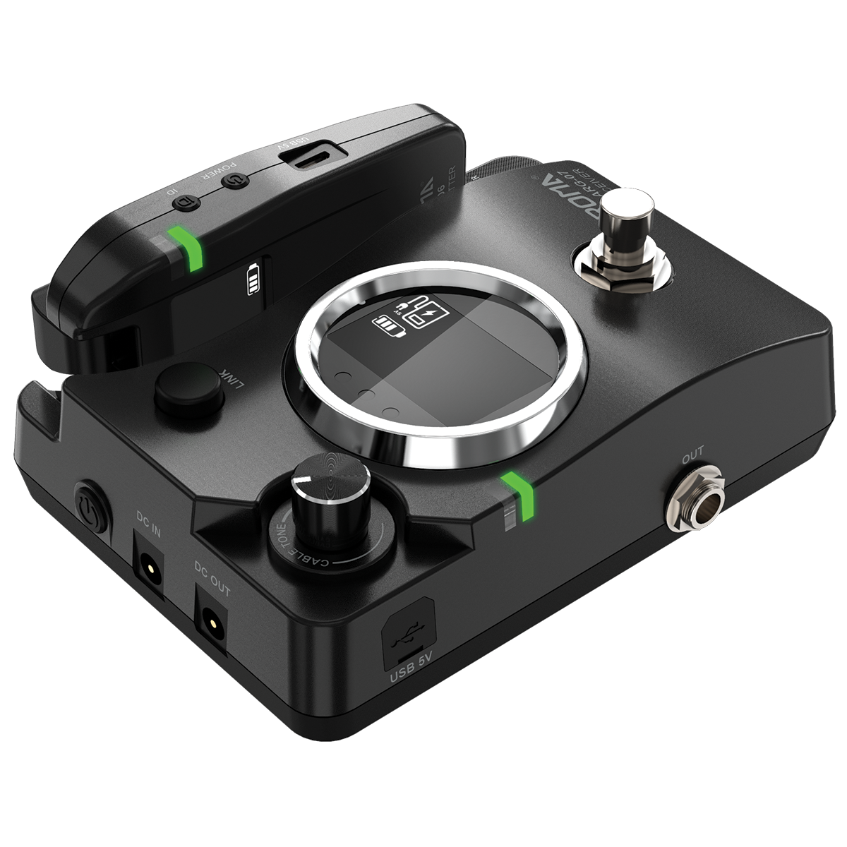 Transmitter and receiver have built-in large capacity rechargeable battery; and the receiver has DC 9V OUT for charging effect pedals.