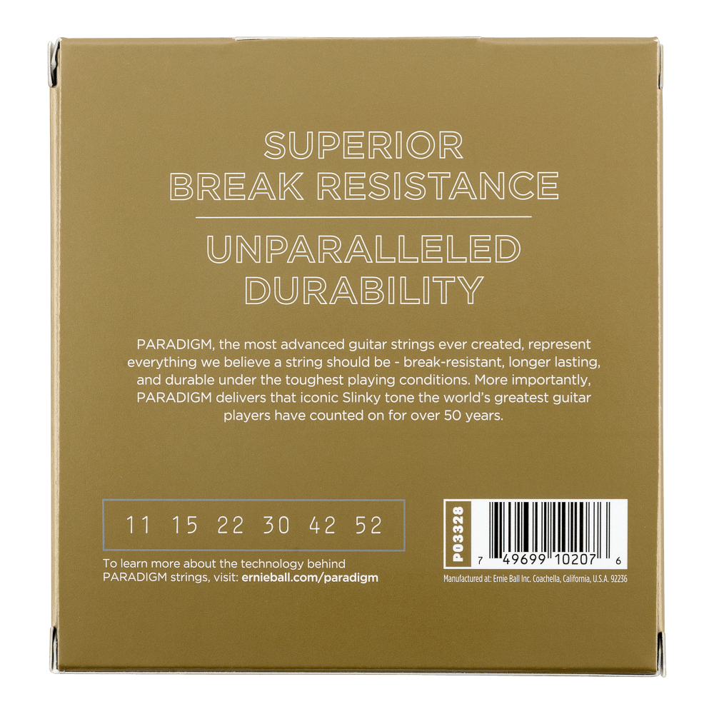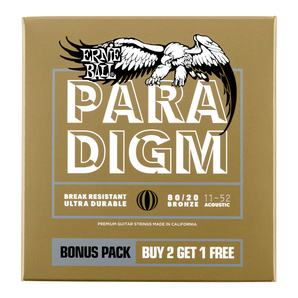 Ernie Ball Paradigm Light 80/20 Bronze electric and acoustic guitar strings feature the world's most advanced string technology. Paradigm strings demonstrate superior break-resistance and unparalleled durability while delivering the iconic Slinky tone Ernie Ball is known for. Select gauges of Paradigm acoustic and electric sets are now available to order in a buy-two-get-one-free bonus pack, giving players the chance to experience even more for a great price. Available in 11-52 gauges.