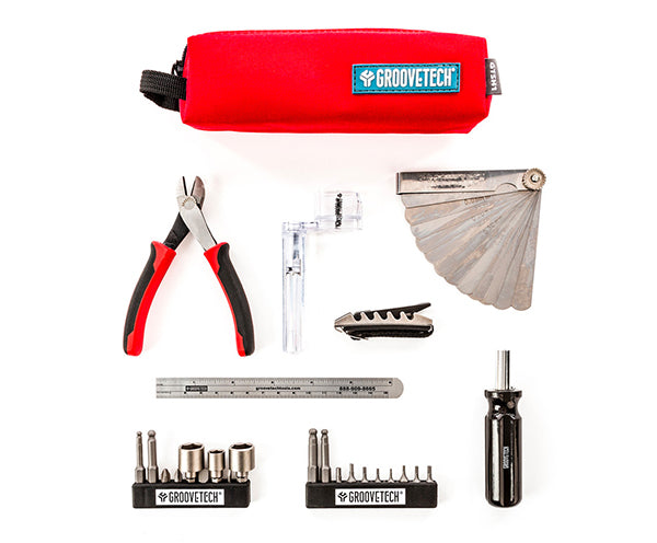 Our GrooveTech series kits are the ultimate for guitar and bass players, but weren't designed to be very portable. The Stagehand kit addresses this, with no loss in capability and at a modest price to boot! Central to the concept is a 19-piece magnetic bit set and screwdriver-style bit holder, with both inch and metric hex wrenches, screwdrivers, and sockets to handle virtually any make and model of guitar or bass. A capo and 15-blade thickness gauge with integrated ruler permit neck measurement, which is essential to proper truss rod adjustment. Also included are downsized string cutters and a string winder. Everything fits into an uber-compact pouch that is ready to hit the road.