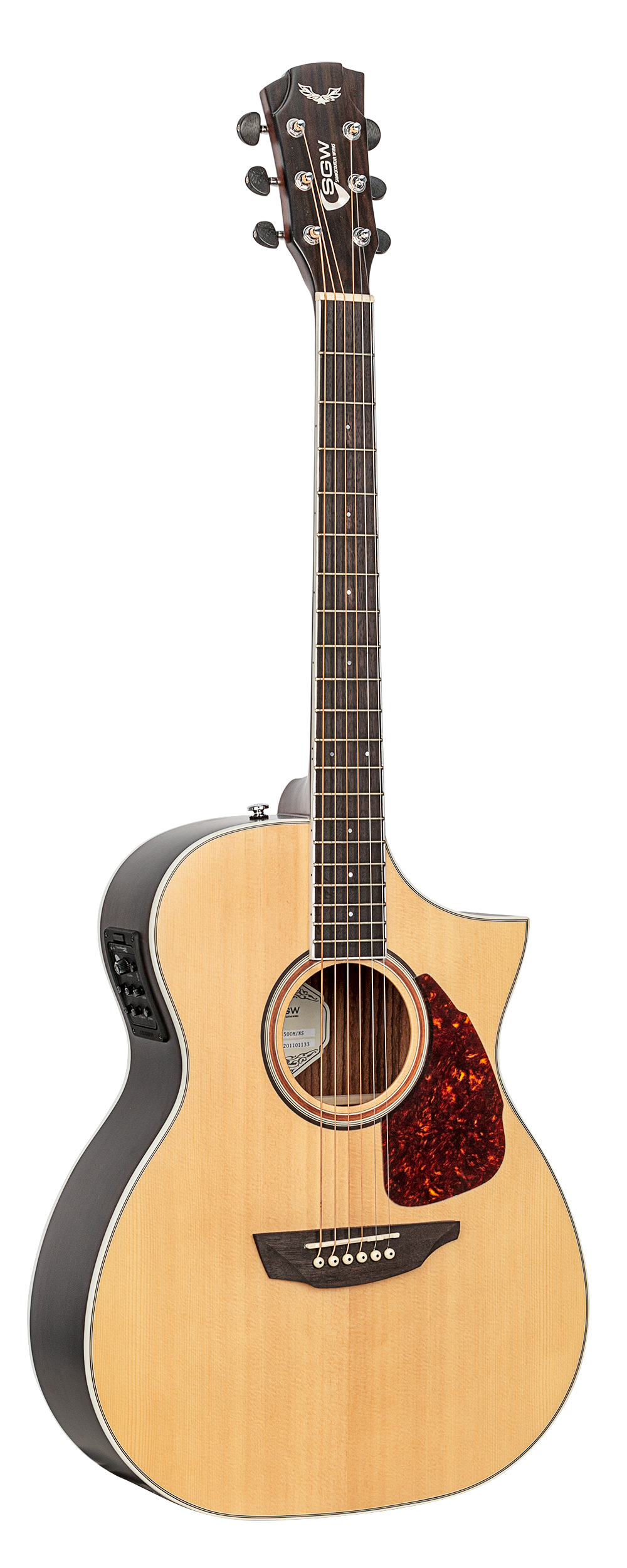 Sharp Florentine cutaway. Solid A grade Sitka spruce top. Solid rosewood back and rosewood veneer sides. Thunderflex™ bracing. Bound mahogany neck with rosewood fingerboard. 2 way truss rod. Mother of pearl dot inlays. 5 ply binding. Rosewood bridge. Graph Tech Canada, NuBone nut & compensated saddle. Mahogany and rosewood multi ply rosette. Tortoiseshell scratchplate. Chrome diecast machine heads with ebony buttons. D’Addario USA strings. Fishman pickup and Clearwave 60 preamp with LED tuner, rotary volume control, 3 band EQ, notch & brilliance filter and phase switch. Commemorative “Samick Est. 1958” chrome plate on back of headstock.