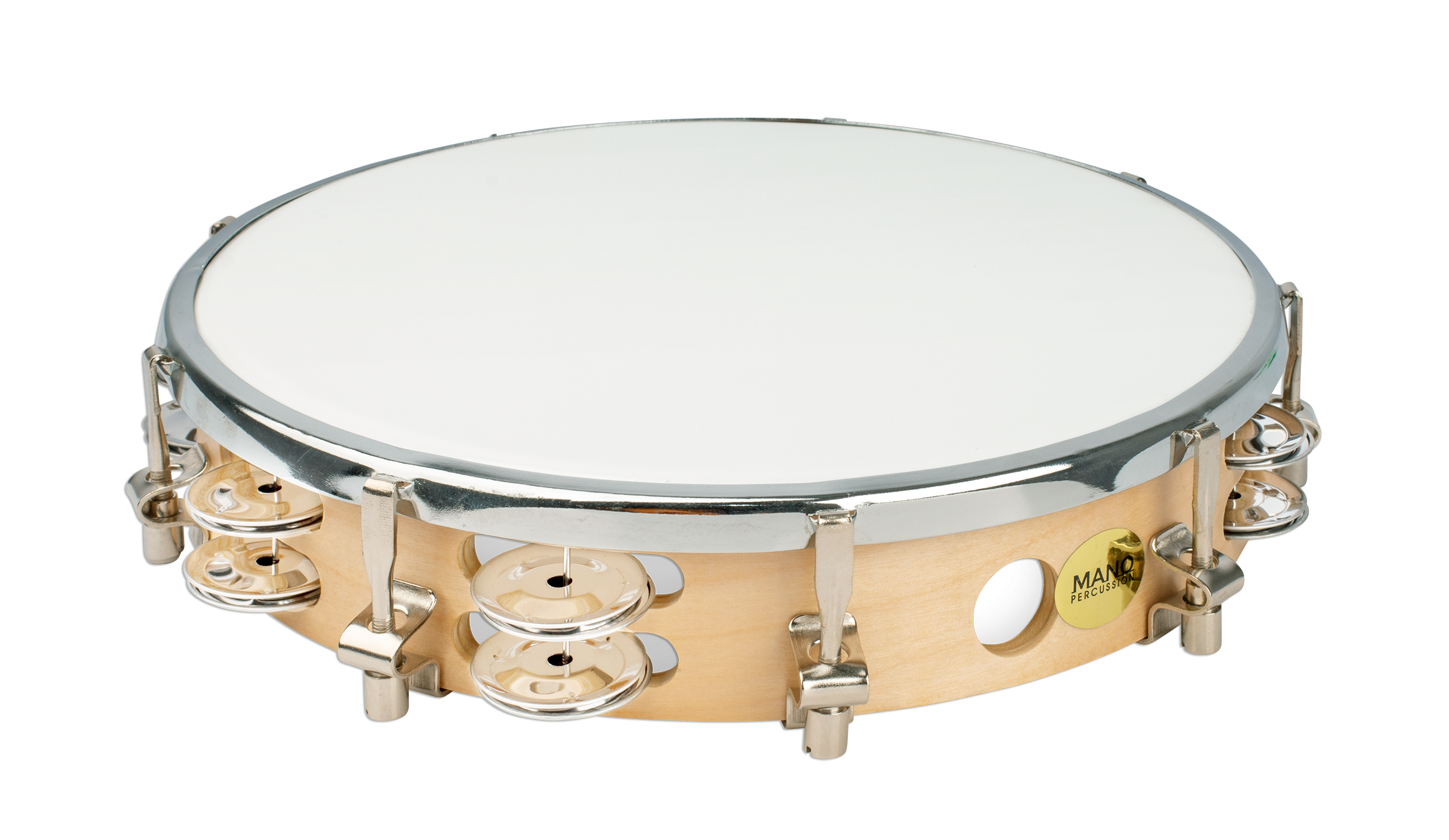 Wood rim with synthetic head. Tunable. 16 pairs of jingles in a double row.