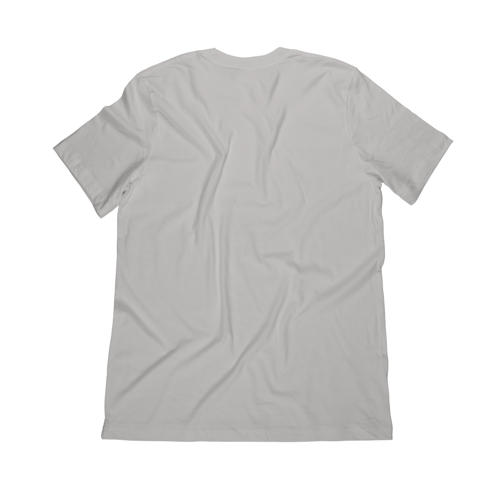 Screen printed gray ink on silver poly cotton jersey t-shirt.