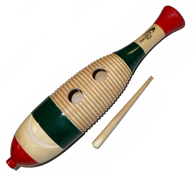 Percussion Plus large-size wooden fish shape guiro in a 3-Tone Green/Red/Natural finish. The Guiro has an overall length of 38cm and a head diameter of 7.4cm. Comes with a wooden striker.