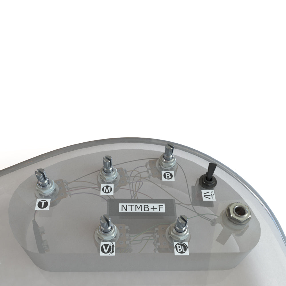 Wired with our NTMB+F pro-level pre-amp and premium audio-quality pots and switches, youll have smooth control and be ready for years of rugged use. We include battery clips and an output jack for quick installation. This configuration has a 3-Band EQ, 5 Pots and 1-Toggle: (Volume with Pull-Bypass Switch) (Blend) (Treble) (Mid) [250,500,800Hz Mid Toggle] (Bass) - Active/Passive.