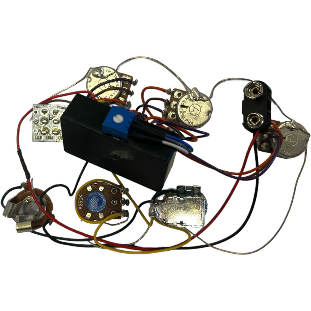 A professionally pre-wired and fully pre-tested harness saves the time and aggravation of wiring your preamp and pots into your instrument. Wired with our pro-level preamp and premium audio-quality pots and switches, youll have smooth control and be ready for years of rugged use. We include battery clips and an output jack for quick installation. All the pots are grounded with a wire that can be connected to the cavity shield or simply cut away if not needed in your installation.