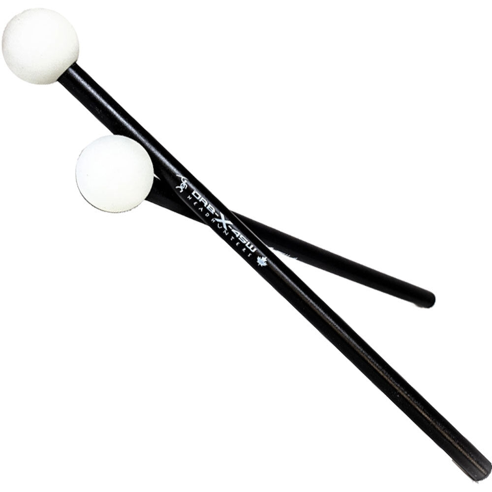 OrB-X are percussion mallets built for drummers. The Orb-X45W has a 45mm white mallet head on a black maple drum stick.