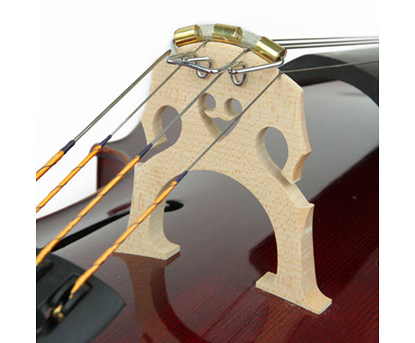 Mute for cello-slide-on wire type. Wire mute stays affixed to string and slides onto bridge for use. Mounts on strings. Made of brass and steel; rubber tubing for protection.