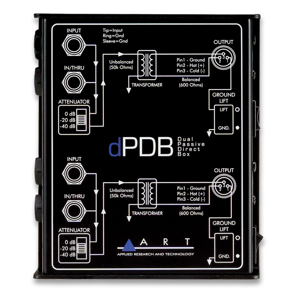The new dPDB Passive Direct Box features two high-quality direct boxes in one portable enclosure. It is a rock solid, roadworthy DI for connection of the outputs of electronic musical instruments (or other audio sources) to the balanced inputs of mixer consoles and other balanced inputs. \n \nIt also allows connection of a music source to an instrument amplifier while simultaneously patching it to a mixer. The dPDB features switchable Input Attenuation (0 dB, -20dB, -40dB), a 50k ohm Instrument Input, 50k ohm Parallel Link jack, a 600 ohm XLR Output Jack, and a switchable Ground Lift. \n \nThe dPDB excels at impedance matching and improving the sound of any instrument plugged into it. The ART dPDB is a must-have in any audio tool kit. Enclosed in a rugged steel chassis, it is designed and manufactured to the highest standards to provide years of quiet, reliable performance. dPDB \n \nApplications: \n