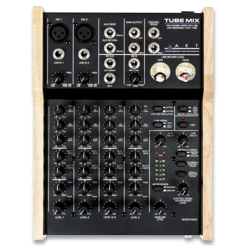 The ART Tube Mix provides a compact versatile audio interface. The Mixer supports two mic inputs, one high Impedance Instrument input, and two line inputs simultaneously. The 12AX7 tube can be assigned to act as a dual channel tube mic preamp, or stacked and applied to the Instrument input for added warmth and tone (with the amp simulator on Channel 5) with guitar or bass. \n \n \n