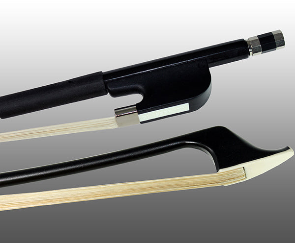 \nTheir standard Fiberglass bows feature a half-lined bow frog with metal under-slide and an imitation three-part button. The Standard Fiberglass bows come in a satin black finish, have genuine horsehair, and a leatherette grip.