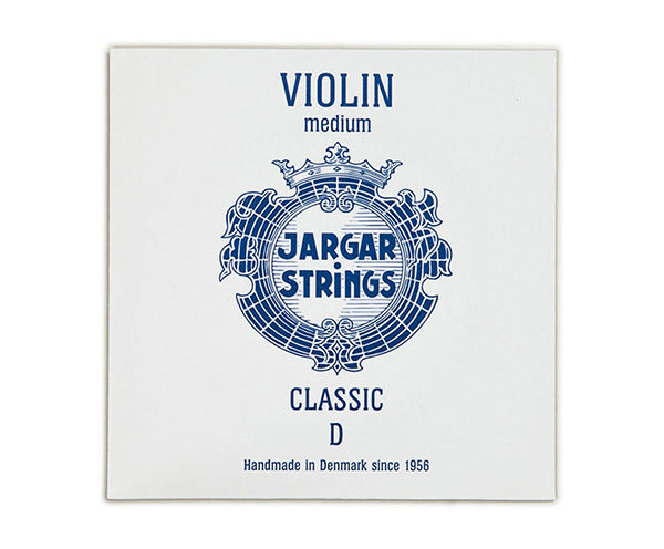 D - Medium "Jargar" Violin Strings. Famous Flexi-Metal strings from Denmark. Delivers a bright full sound with rapid response. (Blue pack)