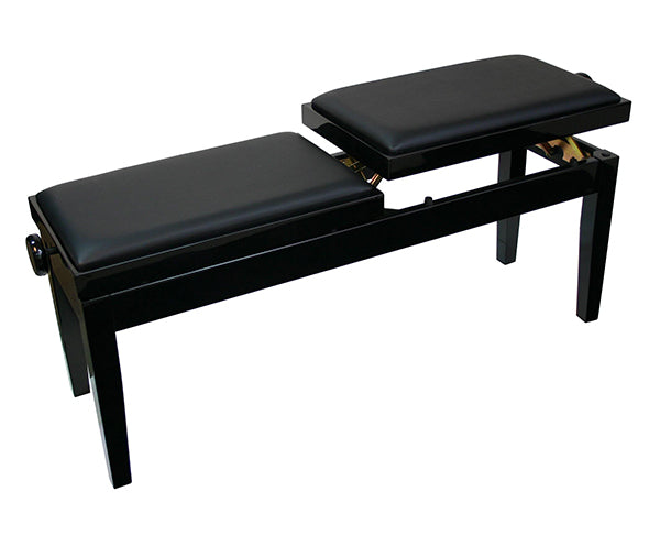 Duet piano bench with ample padding upholstered with leatherette. Double seat design for duets or for teacher and student. Height can be individually adjusted for each seat with knob on each side of the bench. Black gloss finish with straight legs. The sturdy design is easy to assemble with removable legs._x005F \n