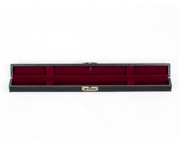 Attractive timber baton case with black vinyl covering and chrome slide-lock. Maroon velour interior with left and right fixed foam pads prevent baton movement when case is closed and an elastic loop offers additional security when the case is opened. Will accommodate a maximum length baton of 380mm. Width and depth of case is 2cm. Made in Japan by Pickboy.