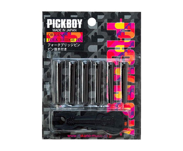 Pickboy Bridge Pin Set. Black with white dot. Attractively packaged, bridge pins in packets of six. Supplied with useful pinpry tool for lifting pins. Made in Japan by Pickboy.