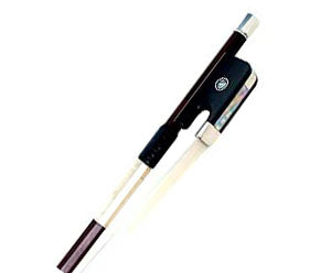 "A. Sandner" Pernambuco Cello Bow. Octagonal. Very fine pernambuco stick, sterling silver set, full mounted ebony frog, Parisian eye, three part screw with eight pearl eye inlays (sometimes supplied with a silver button) and silver wire grip. Made in Germany.