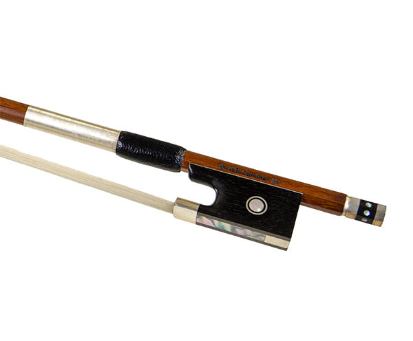 A.R. Sandner Pernambuco - Round. Very fine pernambuco round stick, sterling silver set, full mounted ebony frog, Parisian eye, three part screw with eight pearl eyes inlaid and silver wire grip. Made in Germany.